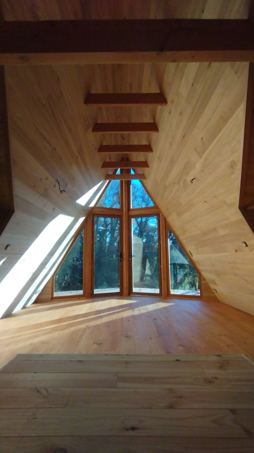 Cette cabane est dotée d’une structure en A et est perchée sur des pilotis en douglas de 3 mètres. Elle possèdes une terrasse couverte de 15m2. L’accès se fait par un escalier et une passerelle. Sa superficie intérieure est de 30m2. Cette cabane est isolée en laine de bois pour un confort été comme hiver.