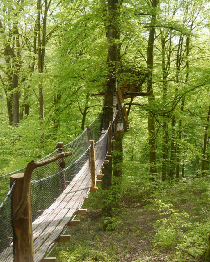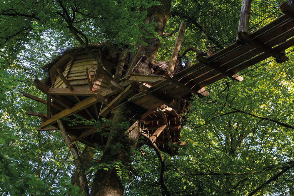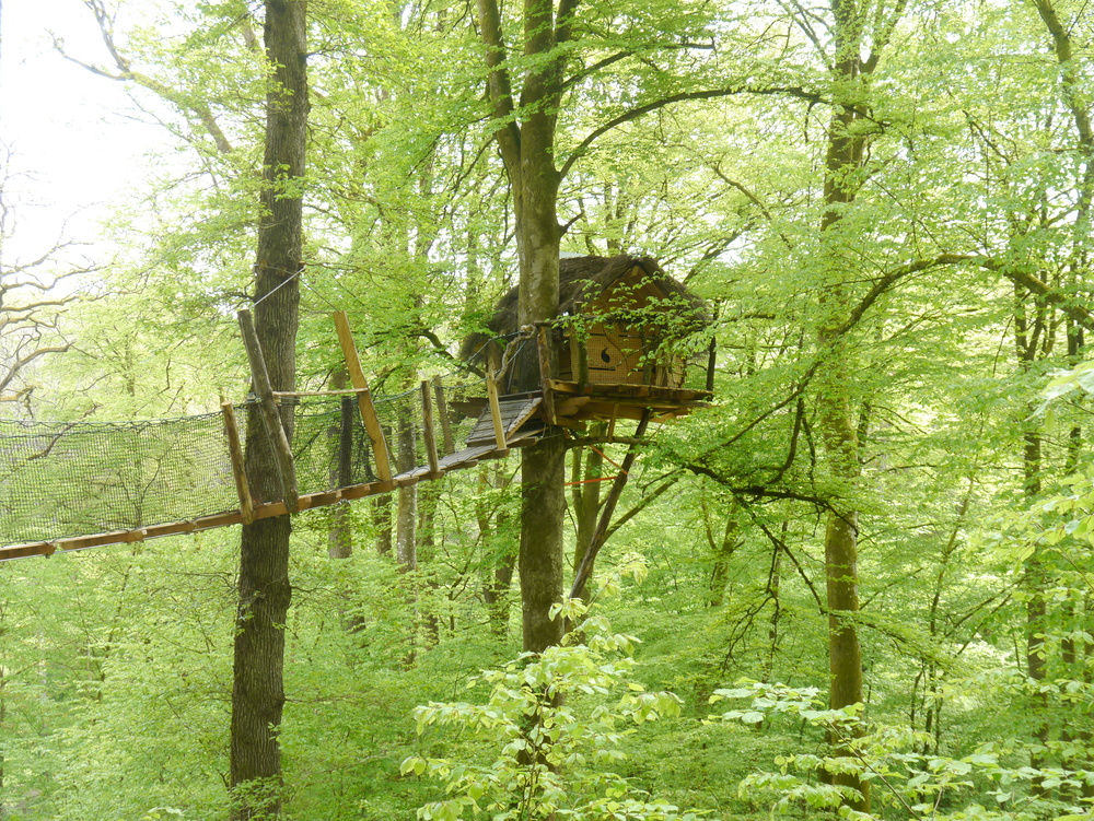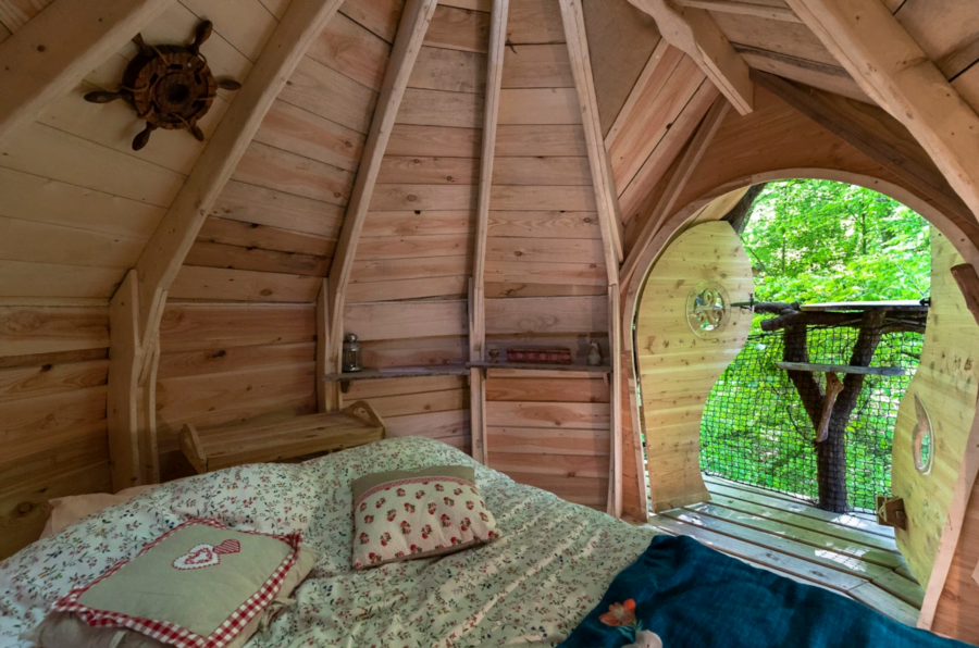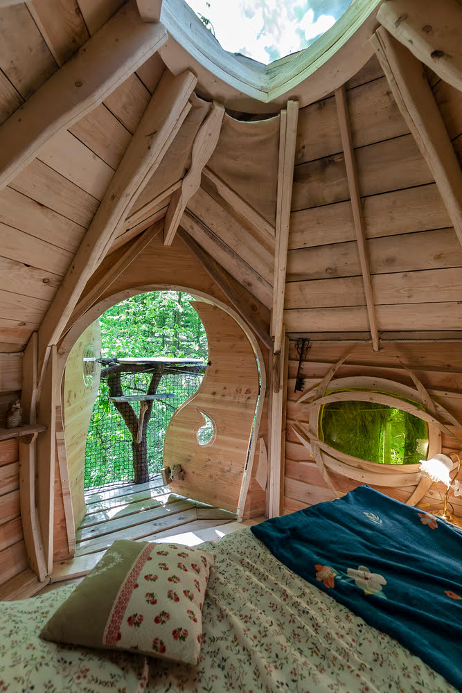 La bulle des fées se trouve à 7 m de hauteur perchée dans un hêtre, on y accède par une passerelle de 20 m en douglas. Cette petite cabane surplombe une clairière au cœur de la forêt, elle offre un espace intimiste avec une pièce ronde de 6 m2 muni d’un lit à l’image d’un nid. Une ouverture zénithale apporte de la lumière et permet de voir la cime des arbres ainsi que les étoiles. Sa toiture est faite de brande de bruyère et les murs extérieurs sont constitués de planches de douglas semi délignées.