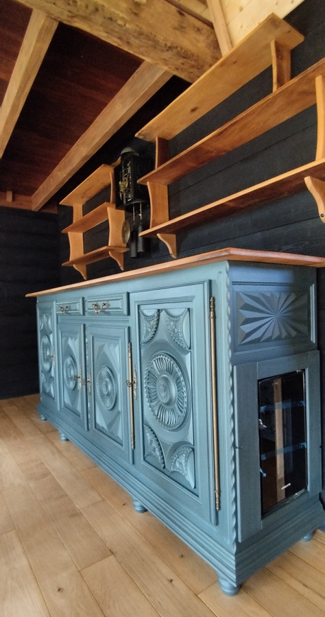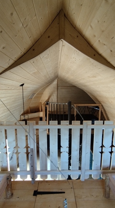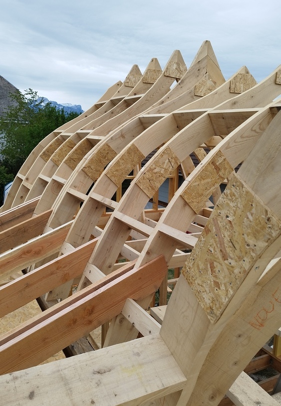 Cette cabane est équipée d’un espace salon, une cuisine, une salle de bain et un toilette. La charpente, inspirée d’une coque de bateau retournée, est déportée créant un angle a 90°. Elle propose donc deux espaces en mezzanine sans vis-à-vis, l’un pour la chambre parentale et l’autre avec deux lits simples. La cabane est munit d’un poêle à bois et d’une grande terrasse offrant une vue dégagée sur les montagnes.