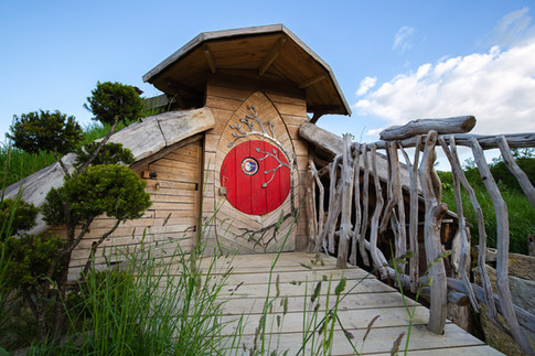 Cette cabane semi-enterrée se trouve au parc d’hébergements insolites Vit tel ta nature. Elle possède une toiture végétalisée et est semi enterrée à 1.50m de profondeur. De forme octogonale elle dispose de deux étages, dont une mezzanine avec terrasse, la hauteur totale est de 5m sous plafond. Une ouverture zénithale au cœur d’une charpente réciproque illumine l’espace. Dans la pièce principale on trouve un espace sous terrain spacieux doté d’une fresque en terre avec incrustation de pierres semi précieuses, un poêle à granulés, une banquette lit pour enfant.