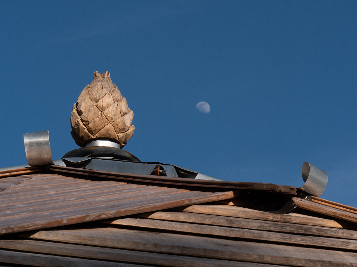 Cette structure de 50m2 est un zome de fréquence 10 disposé sur des murs en ossature bois de 1,6m et isolé par dix centimètres de paille de riz provenant de Camargue. Les menuiseries sont réalisées sur-mesure avec du double vitrage de récupération, en chêne et/ou douglas. Les murs intérieurs sont en épicéa, les arbres secs sur pieds fut prélevés et sciés sur site grâce à une scierie mobile. La toile blanche (feutrine d’imprimerie) est issu du réemploi. La pointe de la structure se termine par un puits de lumière zénithale formant une étoile à 10 branches. En extérieur, la toiture est constituée de deux types de voliges, du mélèze ainsi que du douglas. Les murs sont en enduit chaux et les 10 arrêtes de la structure sont soulignées par des poteaux sinueux en chêne. Le zome est surmonté d’une sculpture en bois d’un artichaut qui fait écho à la forme du bâtiment. L’ensemble fut calculé en fonction du nombre d’or pour créer un espace harmonieux et énergétique.