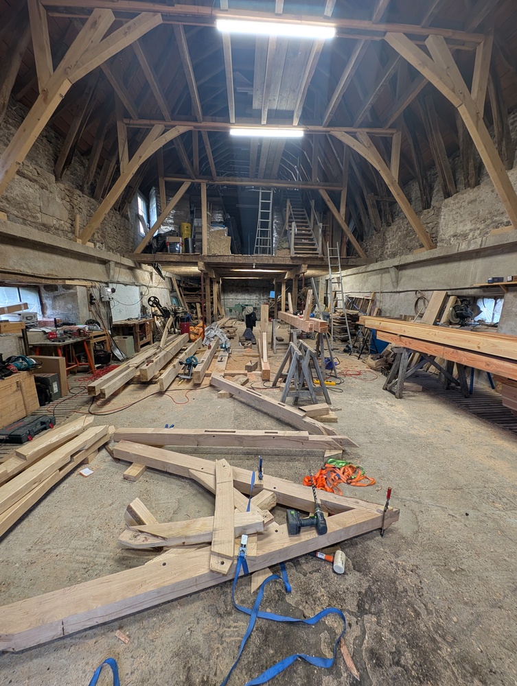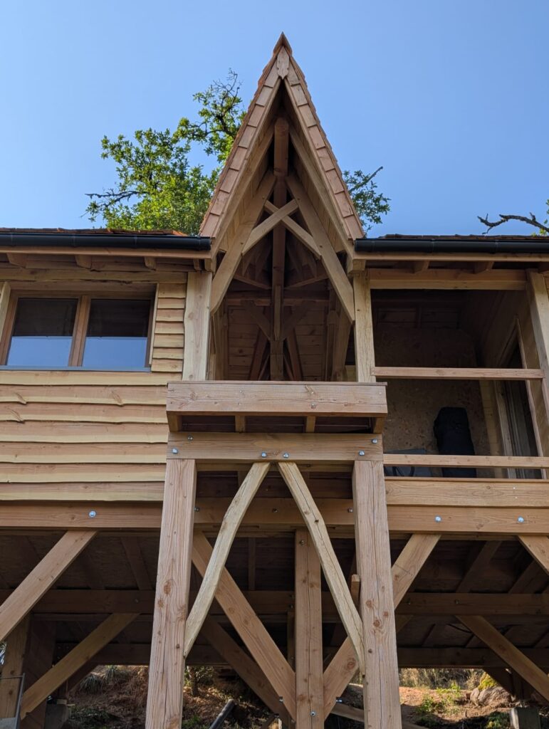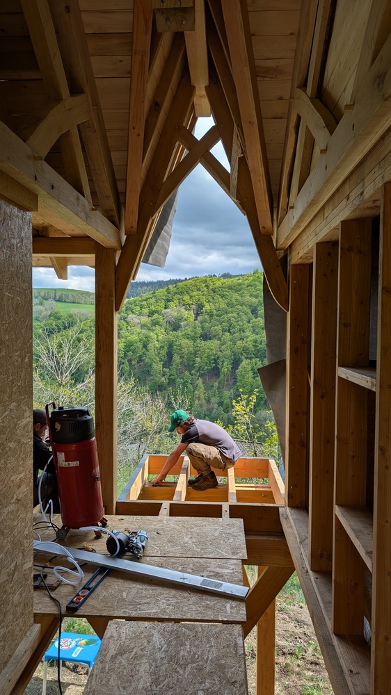 Nous avons préfabriqué le solivage, les ossatures et une partie de la charpente en atelier dans le Lot et avons fait livrer sur site les différentes pièces qui ont était assemblé sur place.