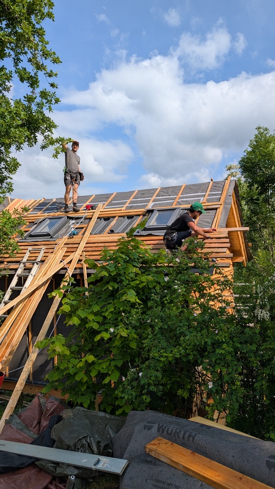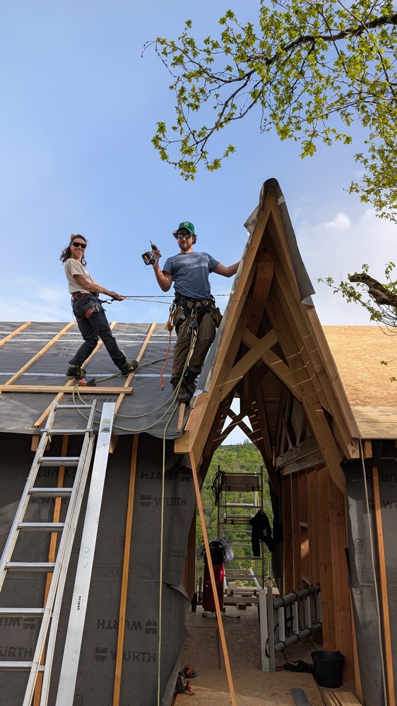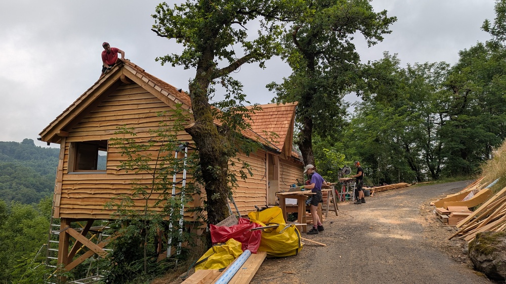 La toiture est réalisée en bardeau de mélèze scié par nos partenaires installés dans le Lot. Nous collaborons avec des artisans locaux, des indépendants et accueillons des stagiaires pour transmettre notre savoir faire et nos valeurs.